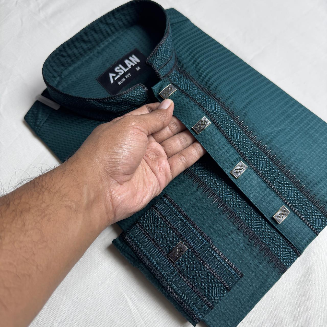 Made with premium textured fabric, this Panjabi offers a slim fit, clean finish, and elevated look—perfect for festive occasions, weddings, and formal gatherings. The intricate placket detailing and structured collar add a distinctive signature touch while keeping the overall design timeless and minimal.